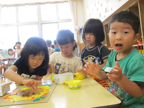 2017年06月13日 プレゼント作り☆ちぎった折り紙で向日葵を作りましたよ■何枚も何枚も貼っていくうちに段々と形になってきて「いい感じ~♪」と盛り上がるひこうき組さん。施設訪問でプレゼントする予定です☆「おじいちゃんおばあちゃん待っててね~!」