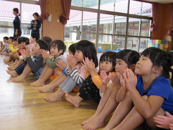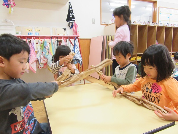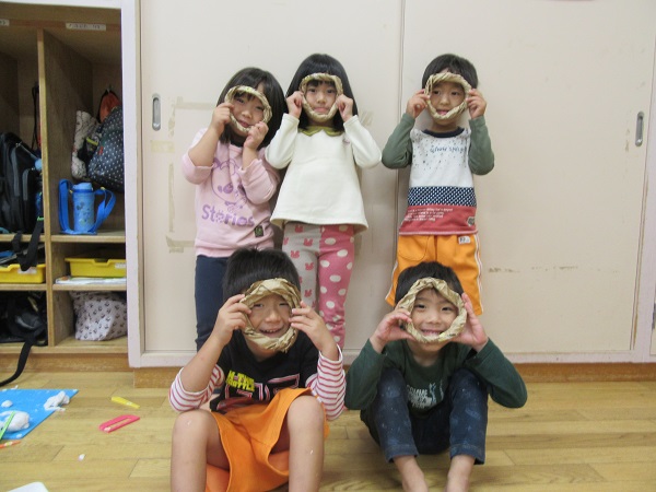 2017年10月30日 作品展に向けて...リースの土台作りをしました✨クラフト紙をくしゃくしゃにしたりねじったり...綺麗な丸になったよ~☺♬「ここにどんぐりつけて...ここは葉っぱで...」とイメージが膨らみます♡その後はみかん組さんのダンスの練習を見学!「かわいいね~上手だね~」と優しい視線を送るひこうきさんでした♡