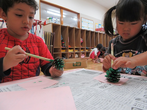 松ぼっくりに絵の具で色を塗りました☆