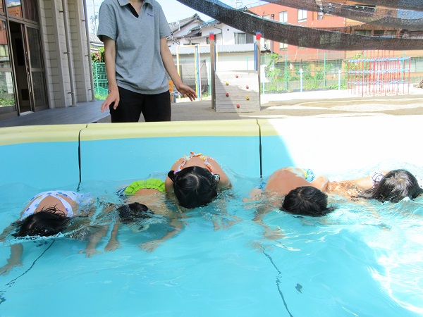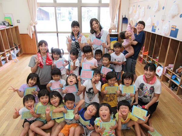 2017年08月31日 最後のプール!今日はプール納めでした。まずはみんなで準備体操!顔付けができるようになったり、潜って泳げるようになったり...いろいろなことが出来るようになりましたよ✨最後はお楽しみのゼリー拾い♡こんがり日に焼けたみんなの顔はこの夏プールで頑張った証拠ですね☺