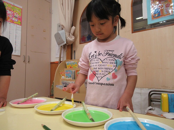 2019年03月07日 内緒だよ♪3月で卒園するろけっと組さんへ、内緒のプレゼントを作りました♡まずは障子紙を四つ折りにして...花びらのかたちになるように、丸くハサミで切っていきます✂切った障子紙は、一つひとつていねいに絵の具で染めていきましたよ♪「きれいな色になったー❤」「次はどの色にしようかな?」こんなお花ができあがりました■ろけっと組さんに、喜んでもらえるとるといいな♡