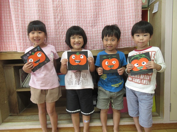 最後はクレヨンを使って、目玉や歯、ヘタ、そして自由に模様を描いて仕上げました。