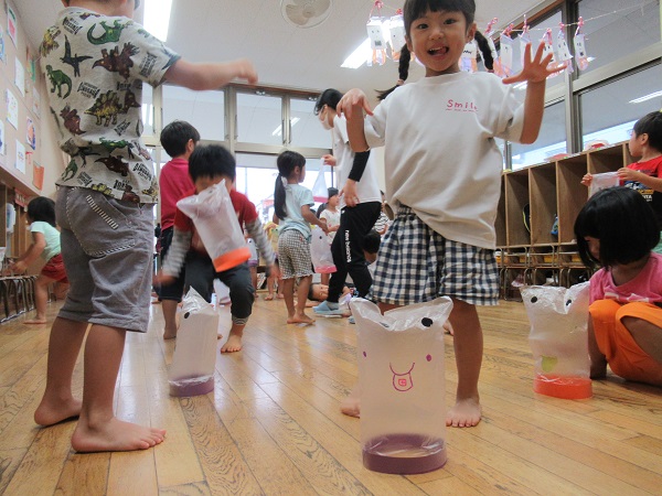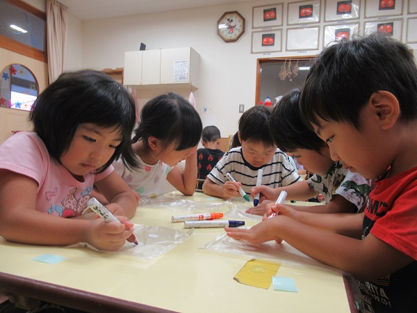 最後は、袋の入り口に画用紙を貼って、重りにしたら完成です!!