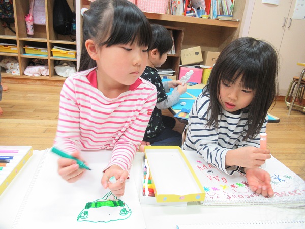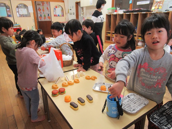 イス取りゲームの後は、パン屋さんごっこ・お絵描き・粘土遊びから好きな遊びを選んで楽しみました。