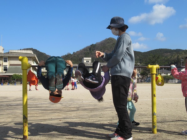 鉄棒では、「見て~」と、技を披露し合っていましたよ。