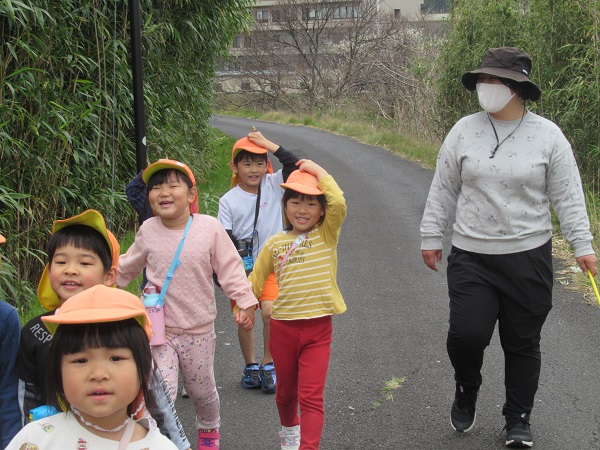 今日は朝から雨の予定でしたが、なんとか天気が持ってくれたので、行先を変更して幼児三クラスで二チームに分かれて川土手をお散歩しました。