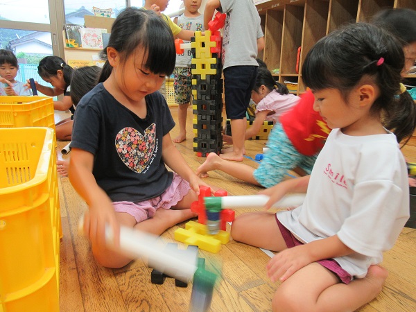 運動遊びの後は、手作りの工具とブロックを使って大工さんごっこを楽しみました。