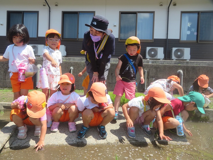 田んぼの方へ歩いて行くと・・・「田んぼの中に何かいる!」と子どもたち。