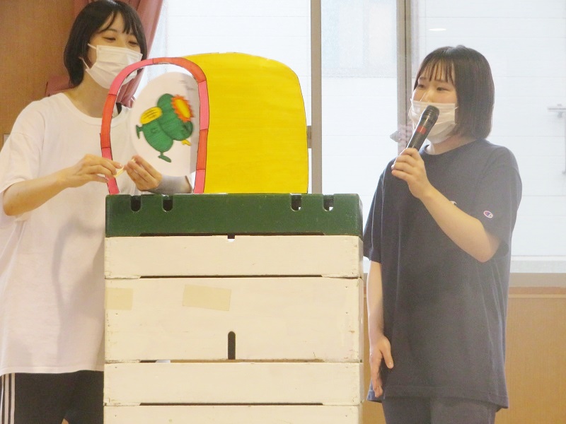 保育者の出し物『へんしんトンネル』を見て楽しみました。