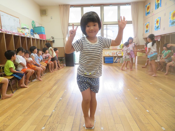 先生とジャンケンして、あいこと負けた人が新聞紙を半分に折っていき、その上に乗れるか競い合いました!