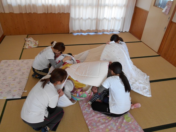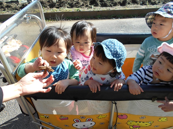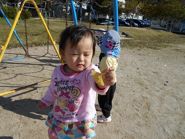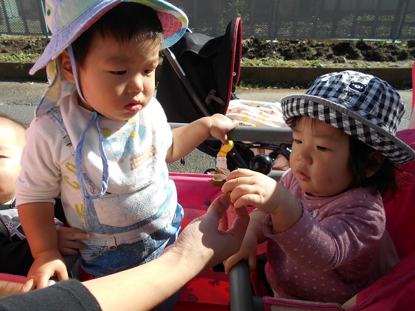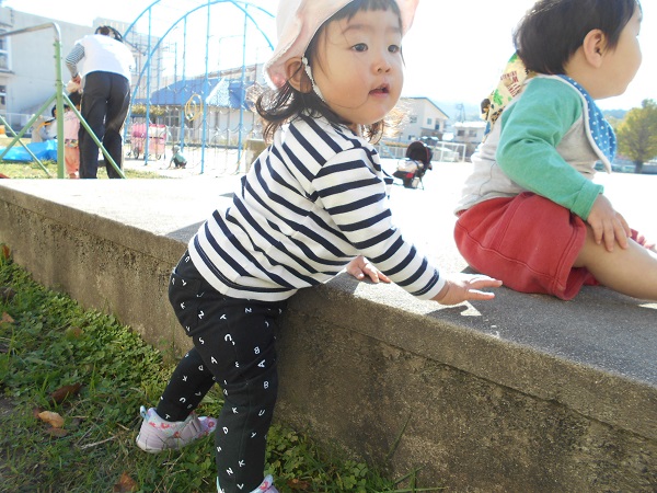 2017年11月10日 木の実見つけたよ☆大田小へ散歩に行くと、椿の殻を発見!!「せんせいー見せてぇ♥」小学校の校庭で遊ばせてもらいました♪こんな段差も平気だよ♪落ち葉もきれいだね■秋風を感じとても気持ちいいお散歩でした✨お昼寝起きに、地震を想定した避難訓練を行いました。