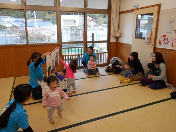 手遊びの後は読み聞かせ・・・☆大型絵本に興味津々の子どもたちでした♡