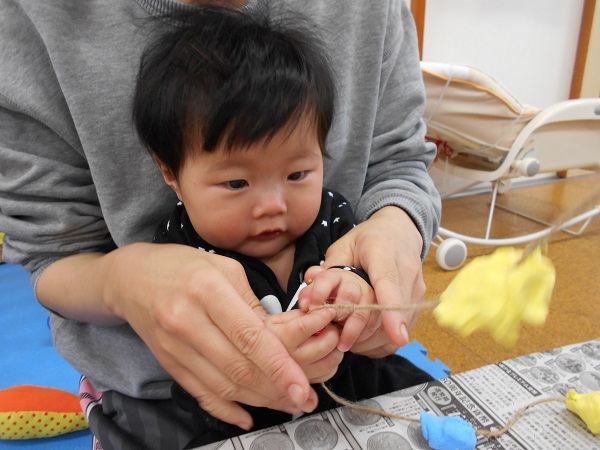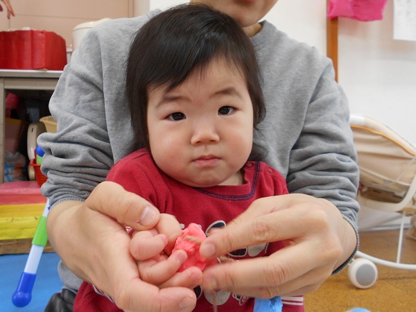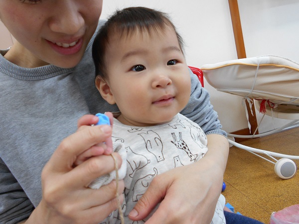 にぎにぎする手元を、興味津々でじっと見つめます■