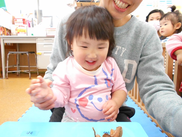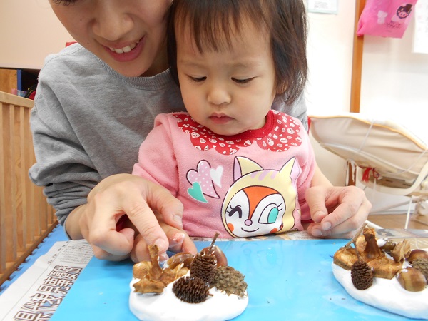 大きいお友だちは、お散歩で見つけた木の実を使って製作をしました。