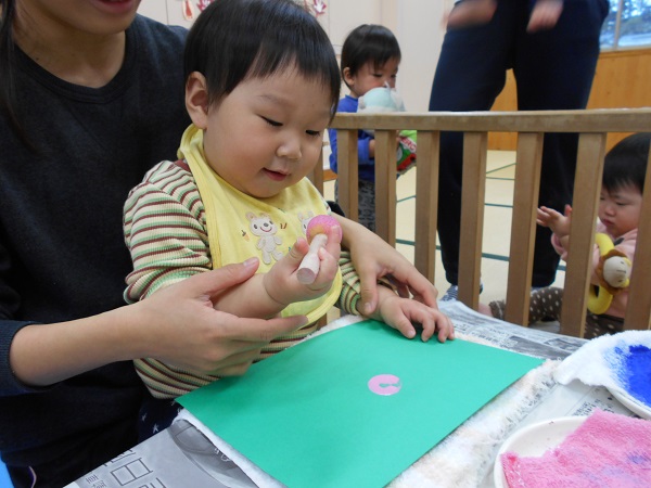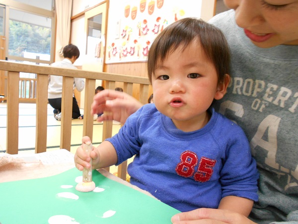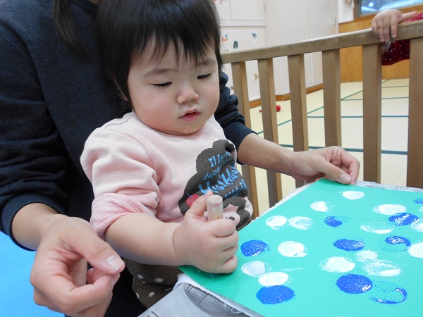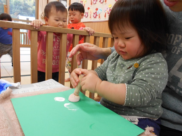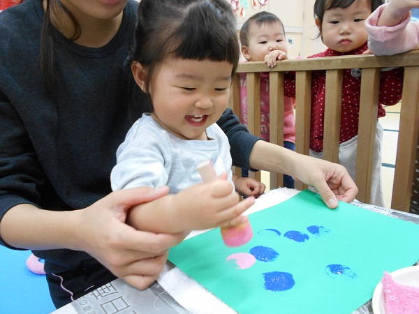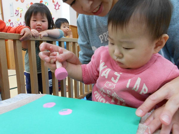 2017年11月20日 ぎゅーっ!ぱっ!タンポを使って製作をしました♬「あっ!できた!」と嬉しそうな笑顔☺両手で頑張って、ぎゅーっ!!「ぎゅーっ!」と言いながら楽しんで押す子もいましたよ♪「ぱっ!エヘヘッ♡」と押すたびに可愛い笑顔✨小さなお友だちも保育者と一緒に真剣な顔で頑張っていましたよ♡何ができるかはお楽しみに...♡