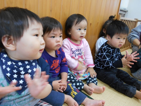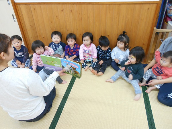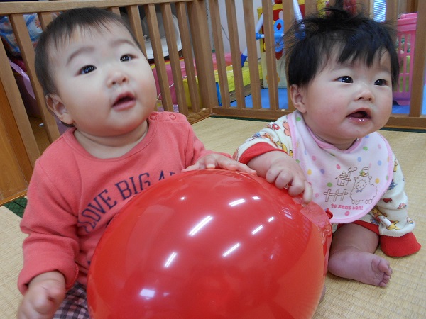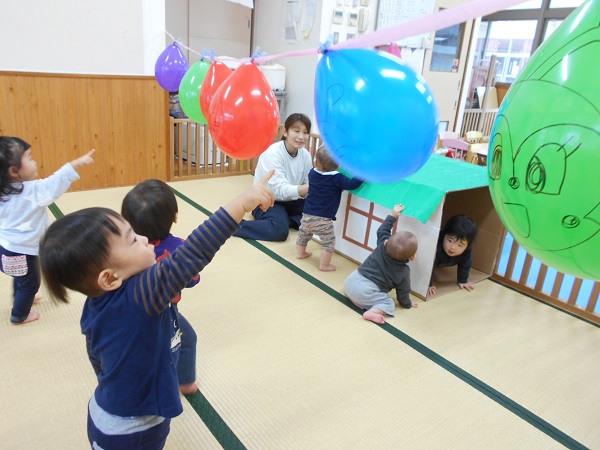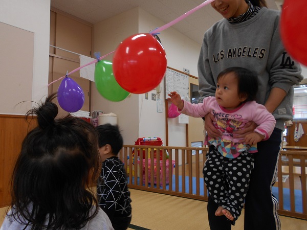 2017年11月30日 風船大好き♪毎朝「せんせいと~おともだち~♬」を歌って、お友だちと手をつないでいますよ✨手をつなぐことが大好きないちご組さんです♡壁の前に座って絵本をみることが上手になりましたよ☆その後は、大好きな風船遊び■小さいお友だちも真っ赤な風船を触ってニコニコ☺ヒモに風船をつけて、先生に抱っこしてもらいタッチ!!風船にアンパンマンの絵を描くと、指をさして大喜びのいちご組さんでした✨✨