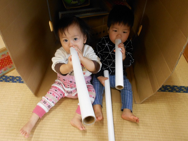 ラップ芯を口につけて、「あ~♬」とおしゃべり✨声が響いて、面白いね!!