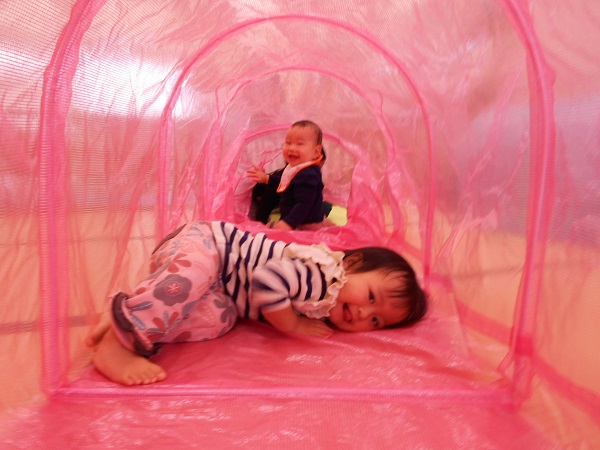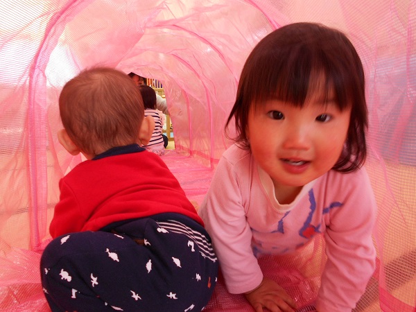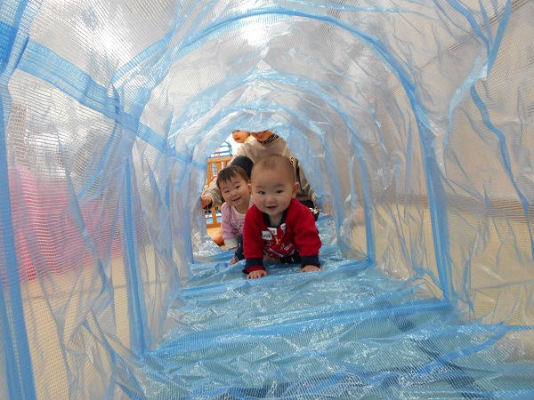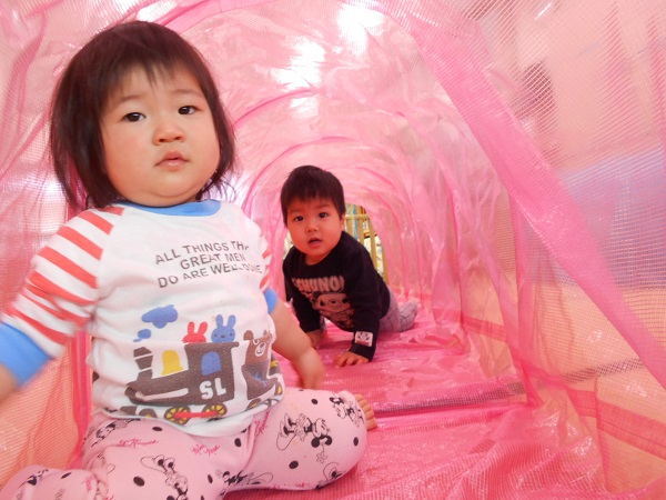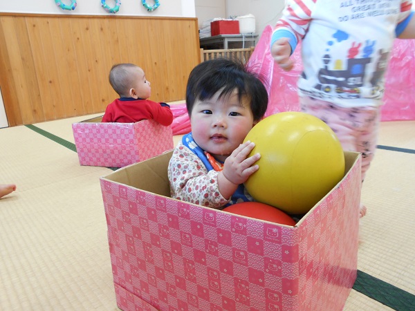 トンネルたのしいな♪お部屋でトンネル遊び✨元気に、いち!に!いち!に!ゴロ~ンと横になるお友だちも・・・♡小さいお友だちも、少しずつ進みましたよ✨にこっ☺と笑顔が可愛いね■ボールでも遊びました☆箱に入ってボールをぎゅーっ■!一番小さなお友だちを「いいこいいこ~♡」よしよしされて嬉しそうでしたよ■明日も元気いっぱい遊ぼうね!