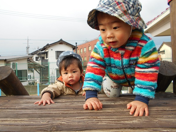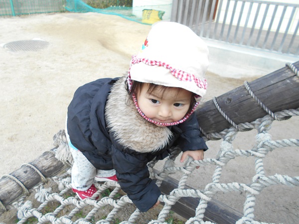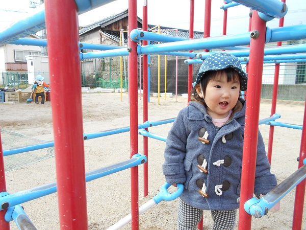 園庭ではすべり台の網のところを一生懸命登ったり...