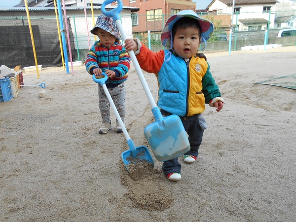 大きなスコップを持って遊んだり...