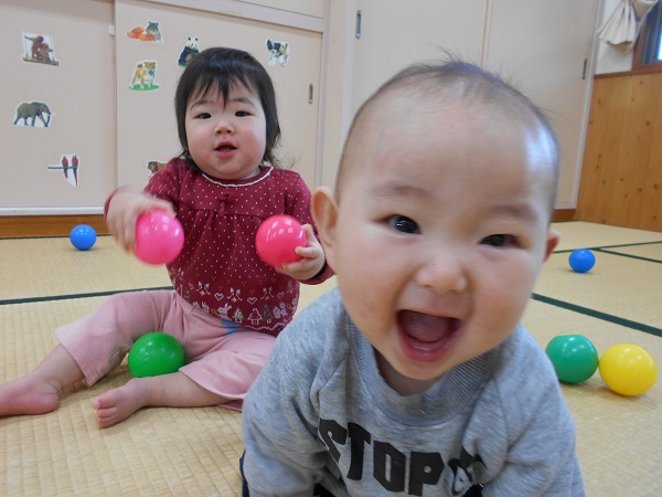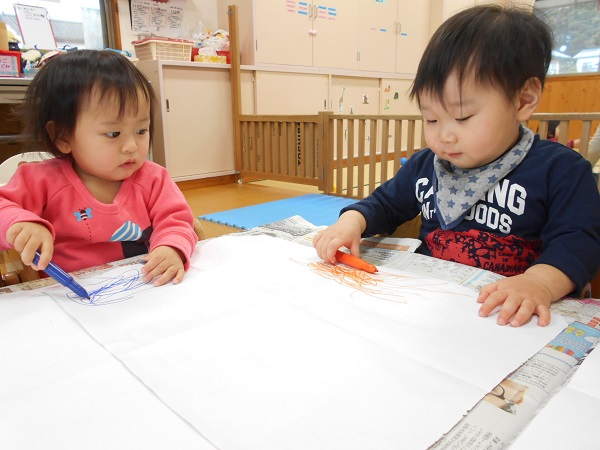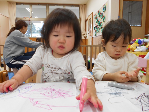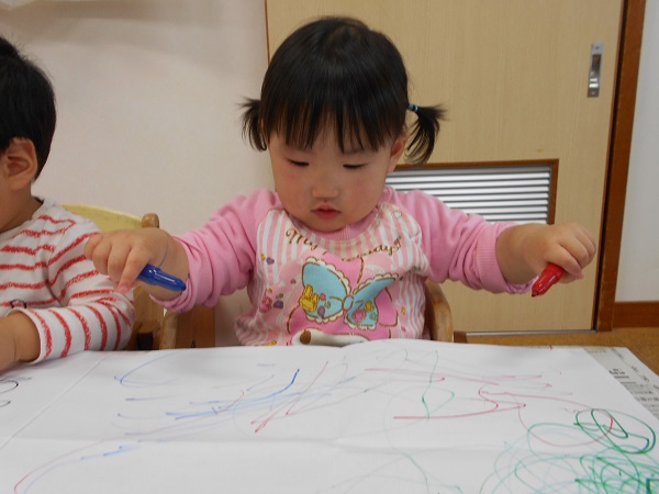 じろじろ♪たのしいな♪なぐり描きをしました☆好きな色を選んで・・・✨「何色にしようかな~?」じろじろ~♪お絵描きたのしいね!「何描いてるの~■??」両手にペンを持っている子も■!小さいお友だちはボール遊び✨笑顔がとっても可愛いね♡♡遊んだ後は、避難訓練がありました。静かにお話を聞いていたいちご組さんでしたよ。