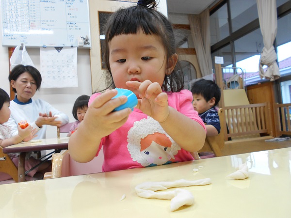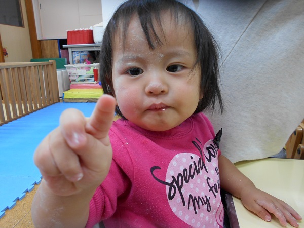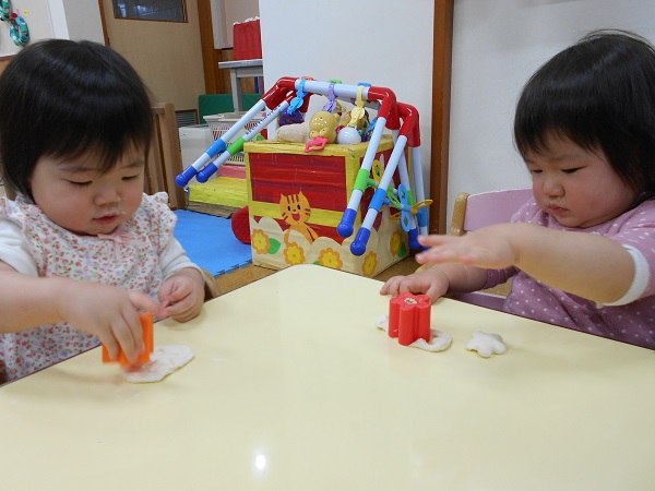 こねこね♪小麦粉粘土遊びをしましたよ♪最初は小麦粉を触ってみました。さらさらしてて気持ちいいね☆お母さんみたいに美味しいお料理を作るわ♡お化粧みたい✨今後は小麦粉粘土をこねこね♬型抜きをしてお花■や星★のかわいい形ができましたお菓子作りみたいで楽しいね☻