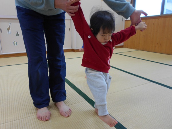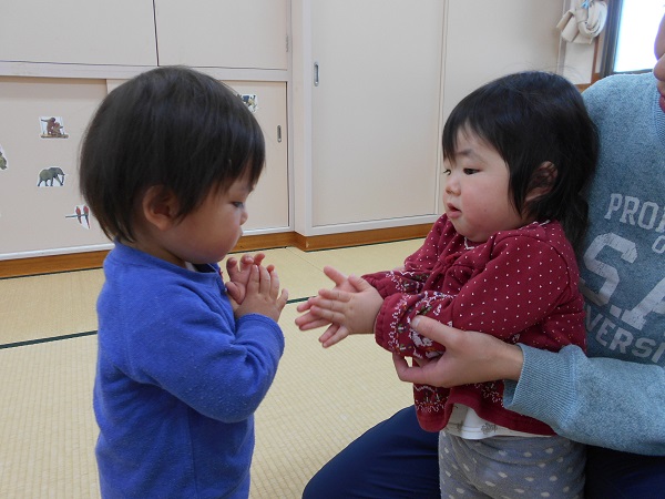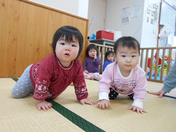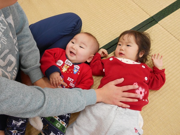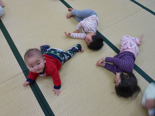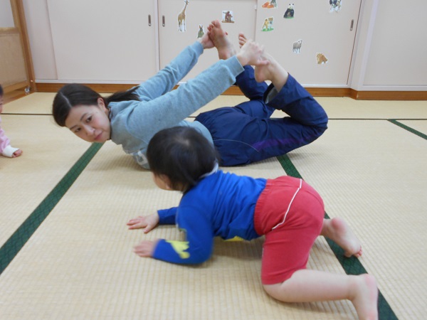 にこにこ☆リズムお部屋でリズムをしました♬ハイハイでお馬さんに・・・部屋をぐるっと周ります■✨次はゴロンと寝転がって、コロコロ~♪お腹をユラユラと揺すってもらい、嬉しそう■めだかさんになって、お友だちとおはなし■支えられながら、片足を上手に「ピッ!」と上げています✨最後はかめのポーズ!「先生すごいな~■」とじっと見ていましたよ■