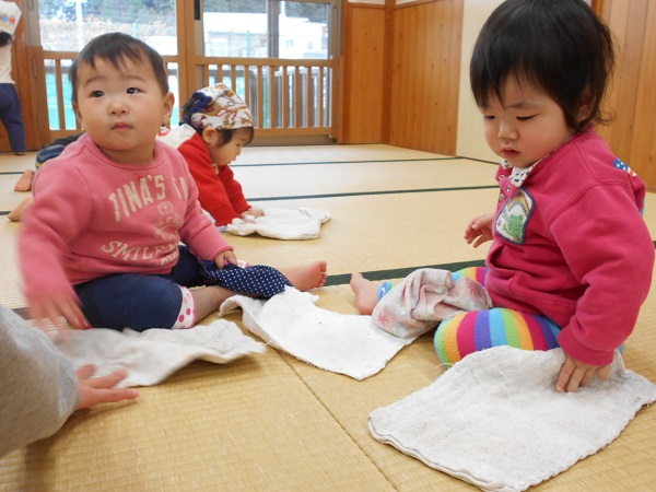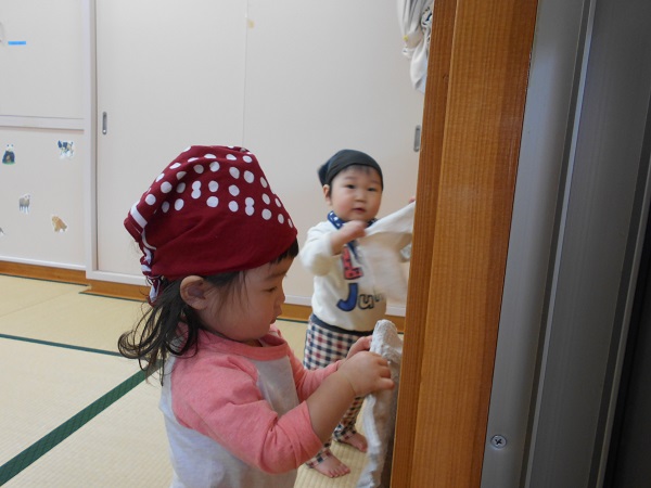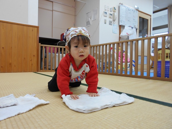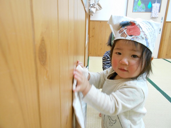 きれい☆きれい☆年末の大掃除!!みんなでお部屋をきれいにしよ~✨✨早速、三角巾をかぶって気合十分♬まずは、窓や壁をきれいにふきふき~♬三角巾を被っている姿も可愛いね♥今度は、畳をきれいに拭きますよ♪みんなのおかげでお部屋がピカピカになりました♡今年も残すところわずかとなりました。来年もかわいいいちご組さんと過ごせることを楽しみにしています♥良いお年をお迎えください