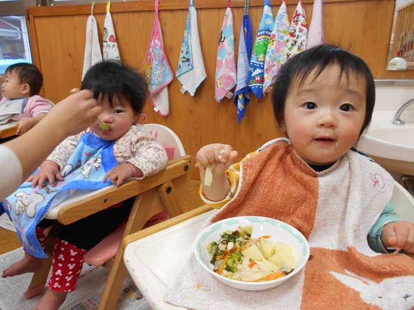 2018年01月09日 お部屋で遊んだよ♪お部屋で手作り玩具やトンネルで遊びました。玩具のシュシュに興味津々!喜んで遊んでいましたよ♬可愛いでしょ♡トンネルも上手にくぐっていましたよ!たくさん遊んだ後は嬉しい給食の時間♡コップ飲みも上手になりましたよ♪給食も大きなお口でパクっと喜んで食べていました♡美味しかったね♡