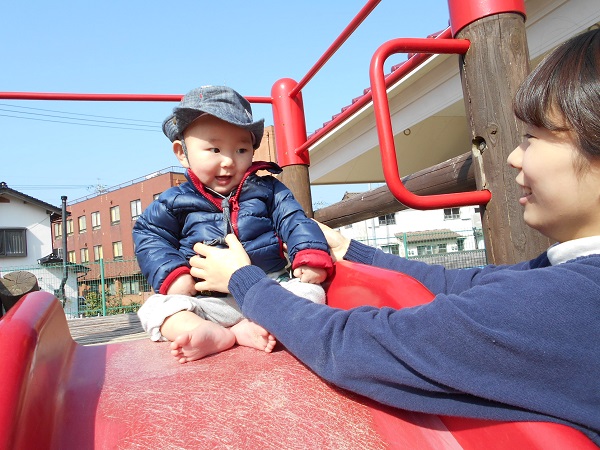 「園庭で遊ぶ人~?」と声をかけると「はーい!」と上手にお返事してくれました♬