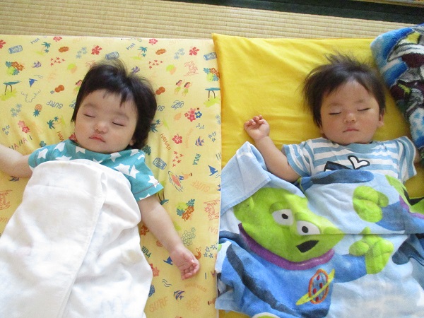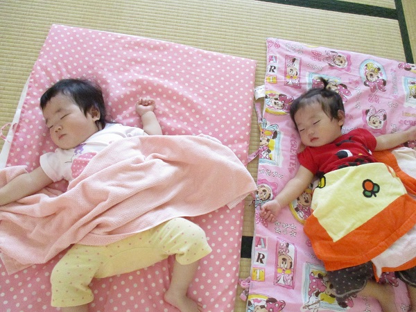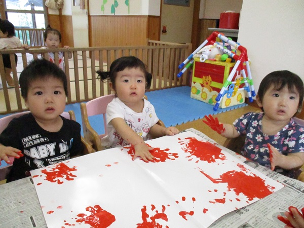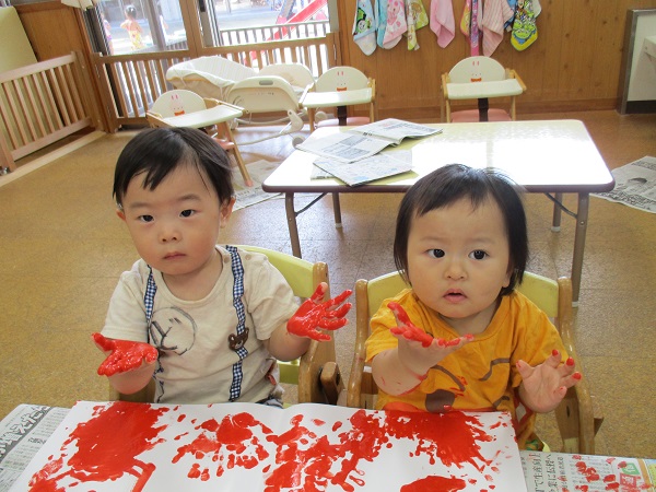 2017年08月18日 夕焼け空の製作をしました♪赤や黄色の絵の具でペタペタ...みんなで夕焼け空の製作をしました♬手が真っ赤になってびっくりしながらも、楽しんでペタペタしていましたよ♪たくさん遊んで、もりもり給食も食べて、ぐっすりと眠る可愛いいちご組さんです♡