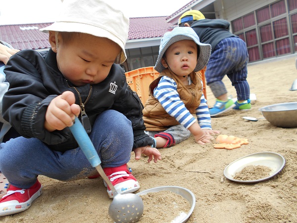 おままごと好きないちご組さんは、とっても上手にスコップやお玉で砂をすくって、容器に入れることができます♬