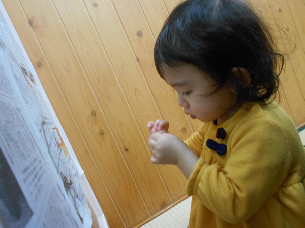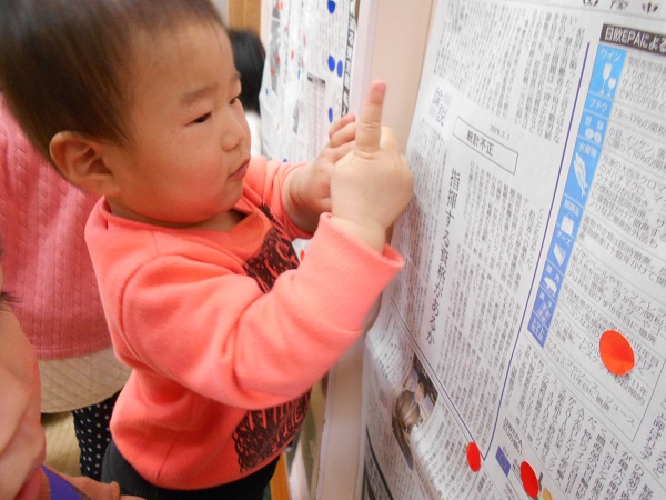 壁に貼った新聞紙にぺったん!!とシールを貼って遊びましたよ♪