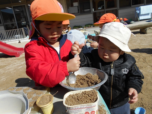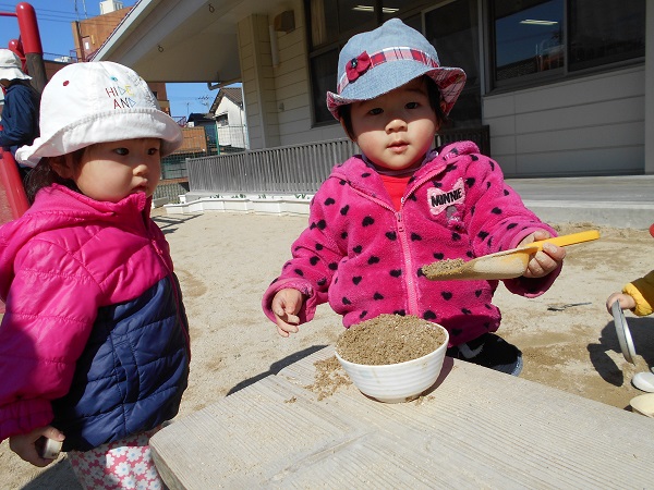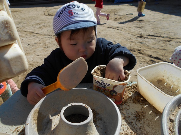 上手にスコップが持てるようになったので、砂をすくってお皿に入れることもとても上手になりましたよ♡