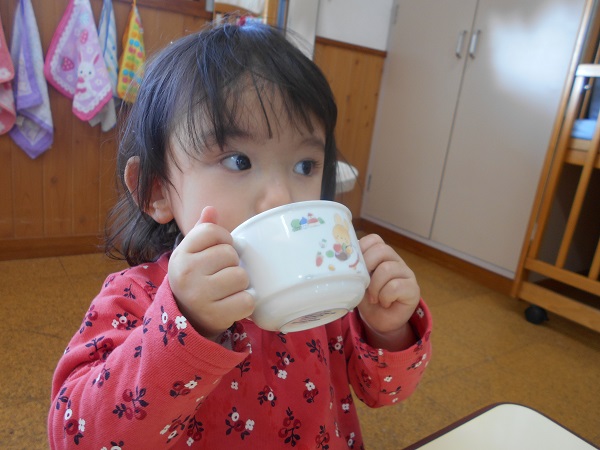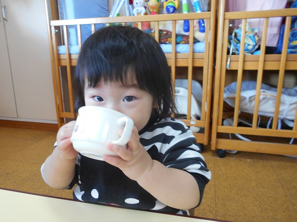 コップを両手で持って、牛乳を飲むいちご組さん■