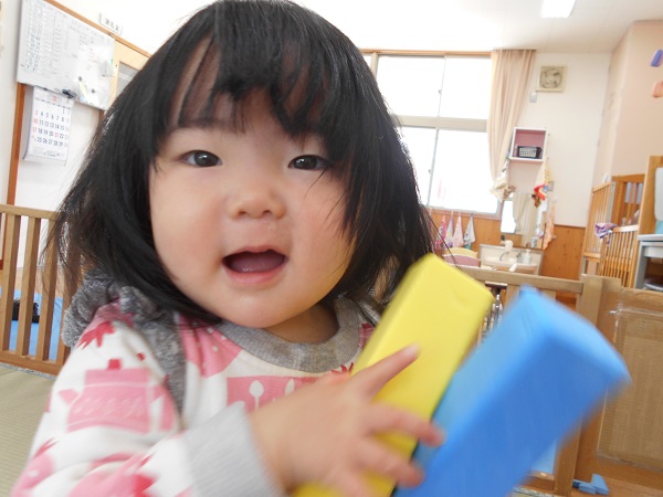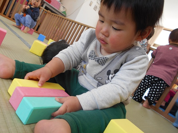 お部屋でスポンジ積み木で遊びました。