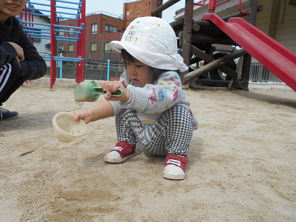 スコップを握り、真剣な表情で砂をすくってカップの中へ入れていました。