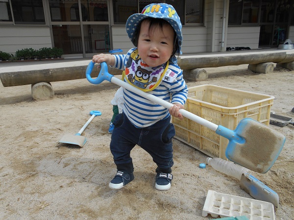 大きなスコップを持ち、とても嬉しそう✨