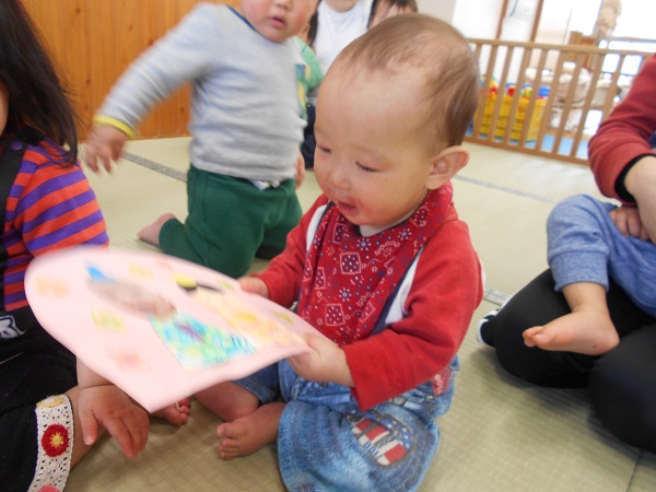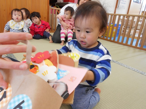 作品バッグの近くに集まり、興奮気味に「あっあっ!」と指さしをして盛りあがる子どもたちでした♬