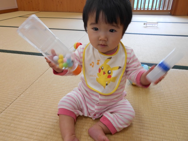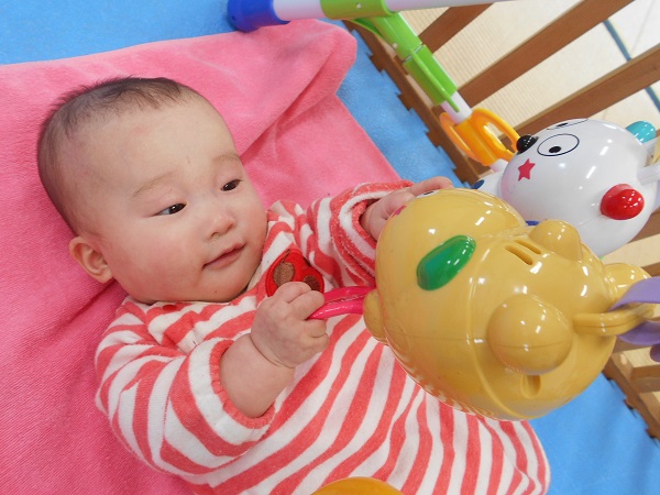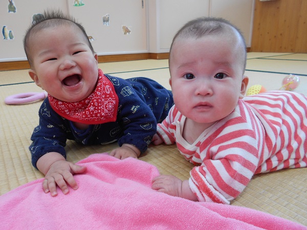 2018年04月17日 かわいい♪いちごぐみ♪お部屋でゆったりと過ごしました。お友だちと一緒に「ハイ!チーズ!」いい笑顔♡シャカシャカ~♪と音の鳴る玩具がお気に入り☆振って嬉しそうにしていましたよ!プレイジムを触ったり、引っ張ったり・・・✨避難訓練があり、ベルの音を聞いてみんなで集まりました。明日も元気に遊ぼうね!