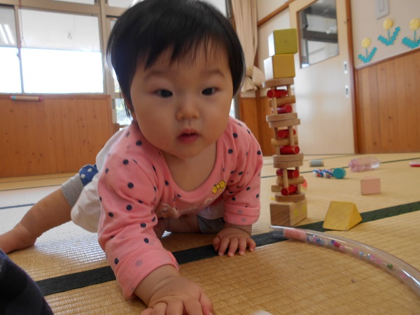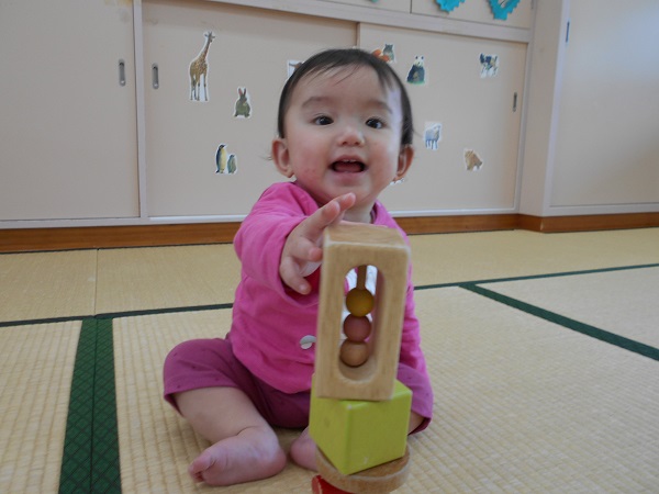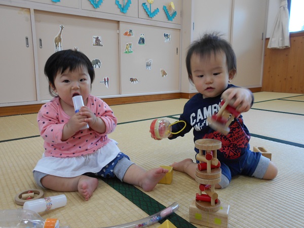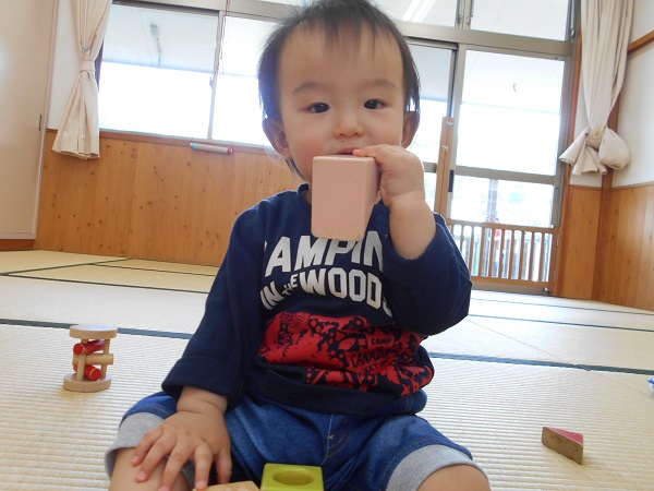 2018年04月23日 お部屋で遊んだよお休みのお友だちが多く、ちょっぴり寂しいいちご組でしたが、お部屋で元気に遊びましたよ♪♪早速、気になるおもちゃを発見~!積み木をもぐもぐ。そーっと重ねてみよ~!触っちゃお~っと!小さいお友だちは音の鳴る玩具を振って、にこにこですよ☺明日は何して遊ぼうかな?♪