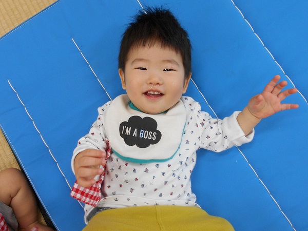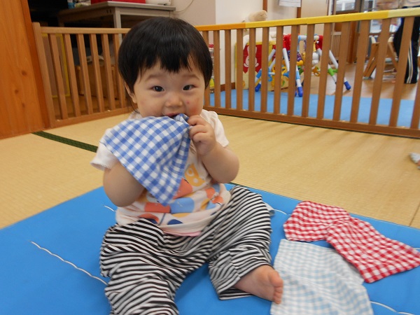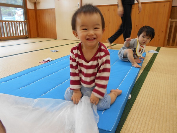 2018年05月23日 マットでごろごろ♪今日はマット遊びをしました☆まずはごろごろしてみたり、上に座って布で遊んでみたり・・・「楽しい~!!!」と、とっても良い笑顔を見せてくれました✨マットの感触も楽しかったね♡初めてのマット遊びに、ご満悦ないちご組さんでした☺