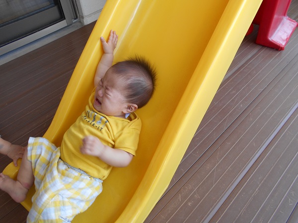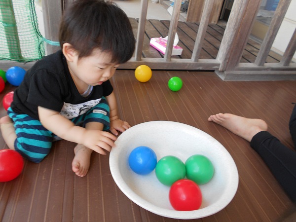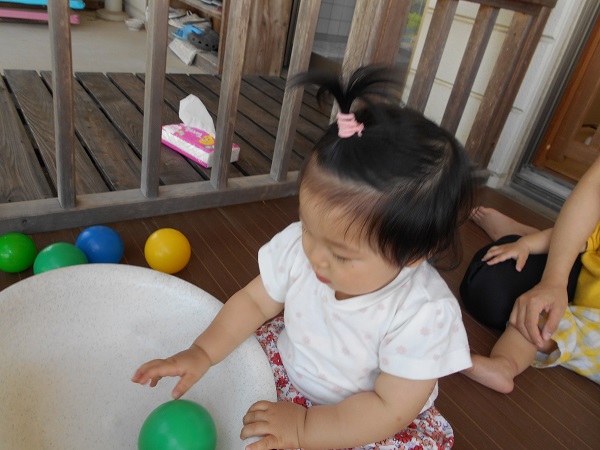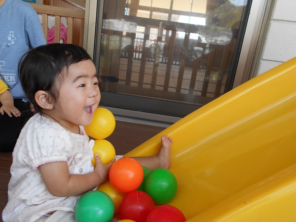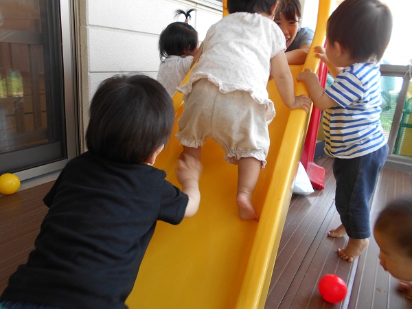 2018年06月25日 テラス楽しいな!今日はテラスに出て遊びました。さっそくすべり台に登る子どもたち☆足と手を使って一生懸命登っていきます!こっちでは滑るのが嫌で泣いちゃう子も・・・☹ボールたくさん嬉しいね♡「お片付けするよー」と言うと・・・たらいにボールを入れてくれるいちご組さん■ありがとう!明日もたくさん遊ぼうね☺