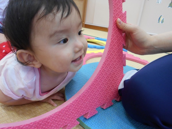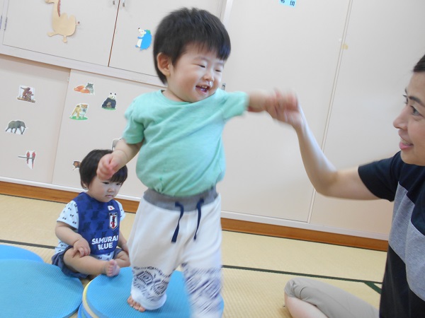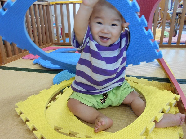 2018年07月02日 楽しいな♪今日はプラポイントで遊びました☆さっそく持って遊ぶ子どもたち!トンネルから覗いて~「ばあ♡」ステージの上からジャーンプ!楽しいね♫小さいお友だちも抱っこしてもらい嬉しそうにしていましたよ♡明日もたくさん遊ぼうね☆