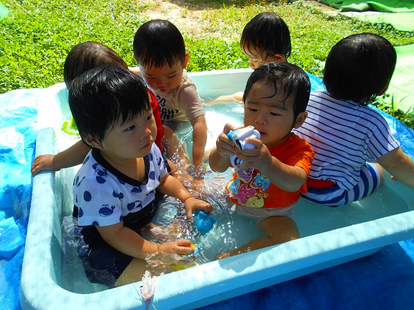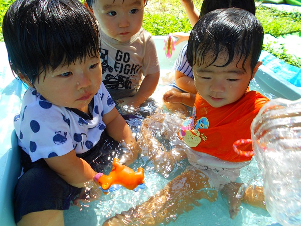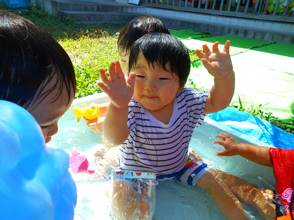 2018年08月17日 プール気持ちいいな♪久しぶりにプールに入りましたよ☺ちょっぴり涙が出るお友だちも・・・■少しすると慣れ、玩具を両手に持って遊んでいましたよ☆お水をバシャバシャ♬いい気持ちだね!上からお水を流すと、手を伸ばして触る子どもたち☺風もあり、心地よく過ごせた一日でしたよ♪来週もたくさん遊ぼうね✨