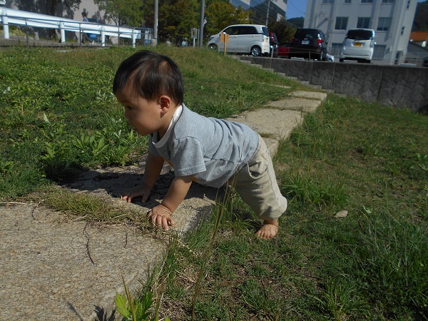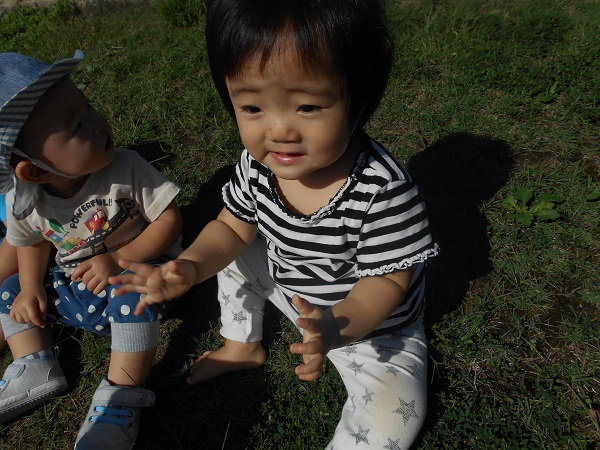 「ひぇぇええ!!なんだかチクチクするよぉ!」草の感触にビックリ!