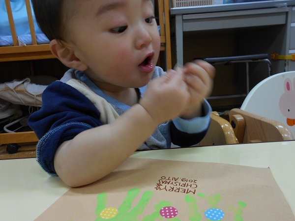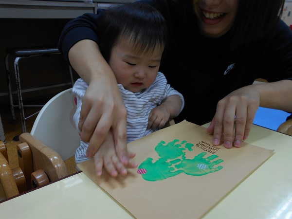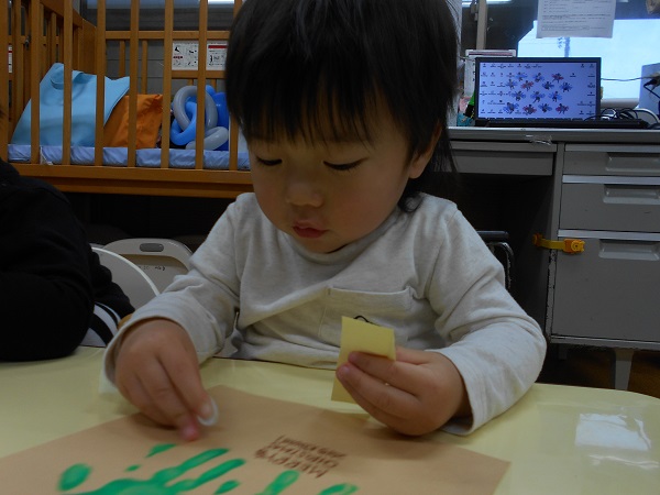 保育者が紙にシールを貼って見せると、両手の指先を使って上手にペッタン!と貼ることができました☆