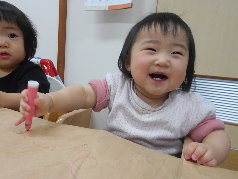 2020年01月27日 じろじろ♪今週もにこにこ笑顔で元気にスタートしたいちご組さん■なにをするのかな...と興味津々な様子の子どもたちです。マーカーを使い、お絵かきをして遊びました。マーカーの持ち方にも少しずつ慣れ、思うがままにじろじろと線を描いてお絵かきを楽しんでいましたよ♪子どもたちの大好きな某キャラクターを描くと...「パンパン✨」と嬉しそうな表情を見せてくれました❤楽しくて楽しくて...終始笑顔の絶えないいちご組さんなのでした■