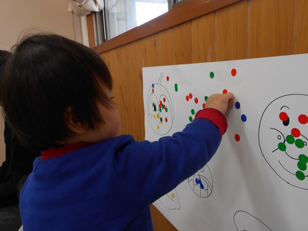 大きな紙にはみんなが大好きなアンパンマンシリーズや果物の絵が描いてあるので、とっても大喜びでしたよ✨