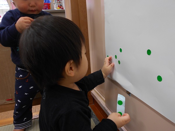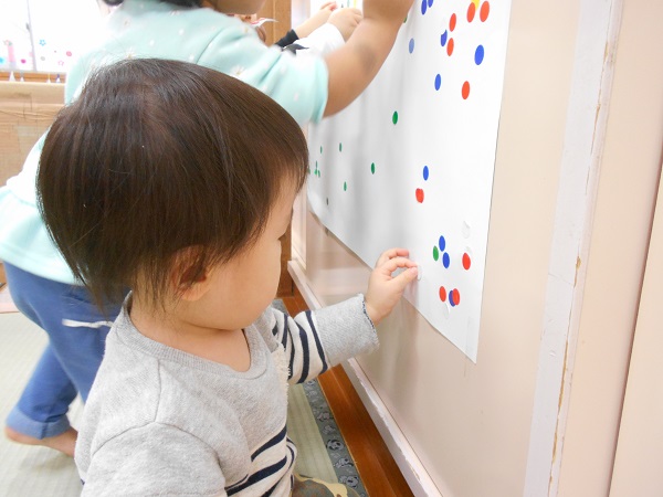 今日のシール貼りは座ってするのではなく、壁に貼ってある大きな紙にシールをぺたぺたして楽しみました♬